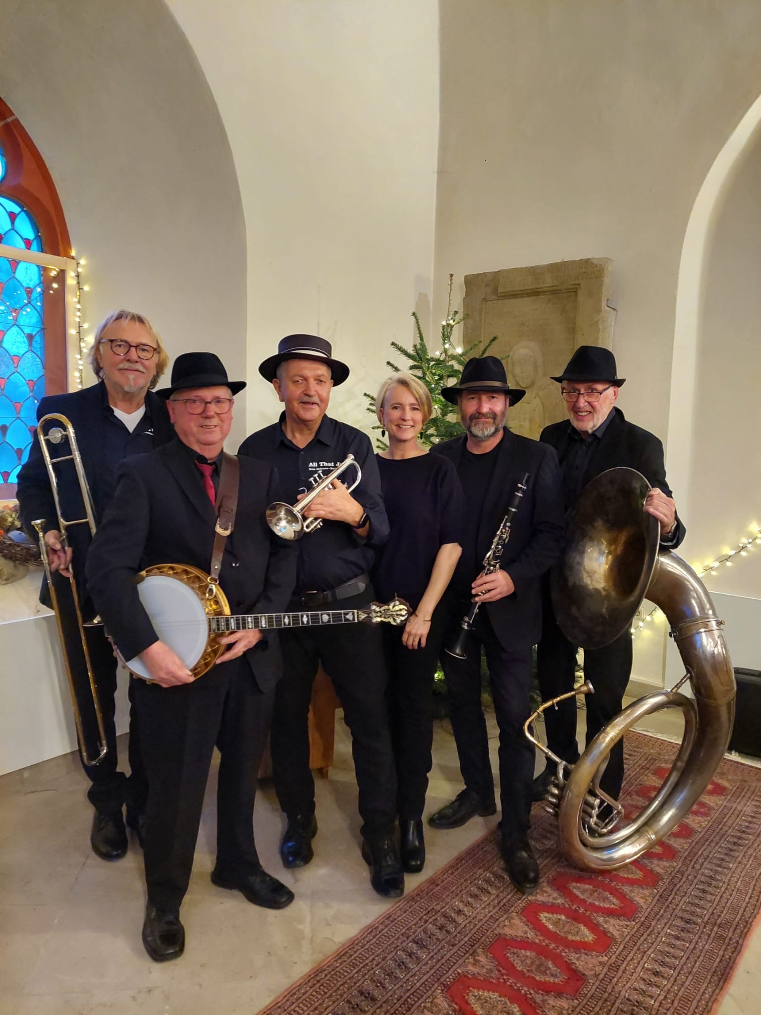 ALL THAT JAZZ bieten außer den üblichen Jazz-Standards ein unterhaltsames, abwechslungsreiches Programm aus allen Musikepochen. Speziell für dieses Konzert haben sie bekannte Musikstücke arrangiert, die die Besucher auf die Adventszeit einstimmen. Die Band präsentiert sich in der Besetzung Toni Krebs (Kornett), Thomas Wagner (Posaune und Gesang), Eric Webster (Gitarre und Banjo), Manfred Pfeifer (Klarinette, Saxophon), Charly Zerfass (Sousaphon) sowie Jasmin Shakir, die die Gesangstitel mit ihrer wunderbaren Stimme interpretiert und durch das Programm führt.
