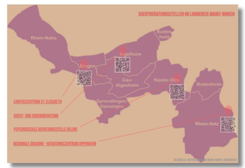 Die Karte zeigt eine Übersicht aller Suchtberatungsstellen im Landkreis Mainz-Bingen. Die Standorte in Nieder-Olm, Oppenheim, Ingelheim und Bingen gewährleisten eine flächendeckende Versorgung der jeweiligen regionalen Einzugsgebiete. Niemand im Landkreis bleibt damit unversorgt. Sie können die Beratungsstellen per Mail oder Telefon kontaktieren und einen Termin vereinbaren. Die Beratungen sind kostenfrei und auch für Angehörige möglich. Auch eine Chatberatung über das Portal digisucht.de ist eine Option, schnell und anonym mit den Berater:innen in Kontakt zu treten.