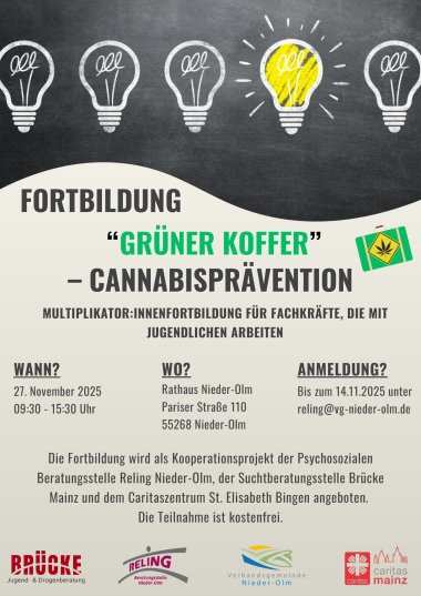 Die angebotene Fortbildung richtet sich an Fachkräfte, die mit dieser Altersgruppe arbeiten. Sie wird als Kooperationsprojekt der Psychosozialen Beratungsstelle Reling Nieder-Olm, der Suchtberatungsstelle Brücke Mainz und dem Caritaszentrum St. Elisabeth Bingen angeboten. Die Teilnahme ist kostenfrei.
