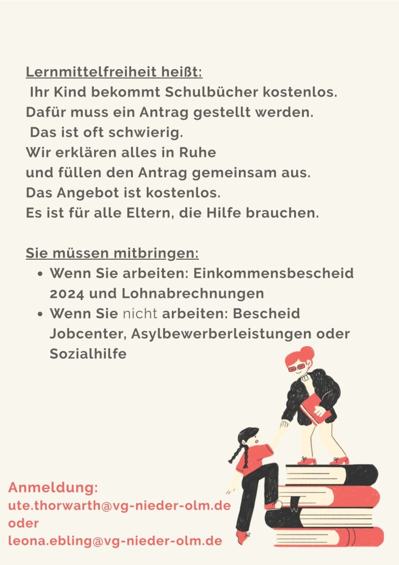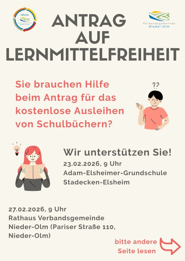 Eltern erhalten dort Unterstützung beim Antrag auf das kostenlose Ausleihen von Schulbüchern für ihre Kinder. Die Veranstaltungen finden am 23. Februar 2026 um 09:00 Uhr in der Adam-Elsheimer-Grundschule in Stadecken-Elsheim sowie am 27. Februar 2026 um 09:00 Uhr im Rathaus der Verbandsgemeinde Nieder-Olm statt.