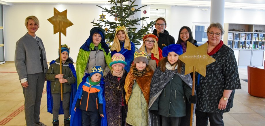 „Schule statt Fabrik – Sternsingen gegen Kinderarbeit“ heißt das Leitwort der 68. Aktion Dreikönigssingen, bei der in allen 27 deutschen Bistümern wieder die Sternsingerinnen und Sternsinger von Tür zu Tür ziehen. So steht 2026 inhaltlich vor allem der Einsatz gegen Kinderarbeit im Mittelpunkt. Mit funkelnden Kronen, Sternen, prächtigen Gewändern und Liedern auf den Lippen zogen acht Kinder und deren Begleitungen durch das Verwaltungsgebäude, klebten dabei den Segen über die (Büro-)Türen und sammelten Spenden für den Kampf gegen Kinderarbeit. Empfangen wurden sie von Doris Leininger-Rill, der Ersten Beigeordneten der Verbandsgemeinde Nieder-Olm, und Ute Breivogel, der Büroleitung.